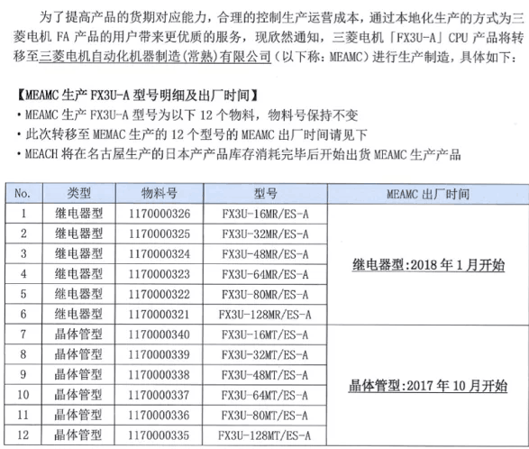 FX3U-***/ES-A 系列產品是三菱FX系列最重要的產品,目前各代理商收到通知,三菱將把此產品更換到三菱常熟工廠生產