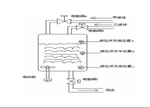 1.在最下方時,則應該先按復位按鈕,排出罐內液體,保證料位液面處于最下方或容器是空的,這時各個閥門A、B、C均為OFF,液位傳感器H、M、L均為OFF,電動機M為OFF。