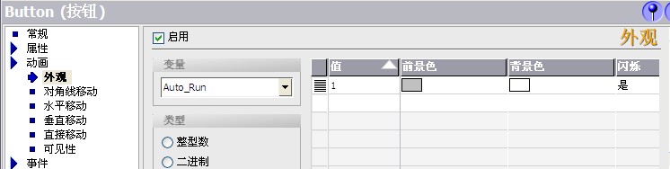 小弟用wincc flexible 編寫觸摸屏程序,其中設置自動和手動控制切換按鈕在各自工作狀態下為閃爍,以便在功能設置時觀察到時處在何種工作狀態下,其中手動,自動切換變量為M2.0,當M2.0為0的時候處于自動控制,自動控制按鈕里的動畫設置為閃爍;