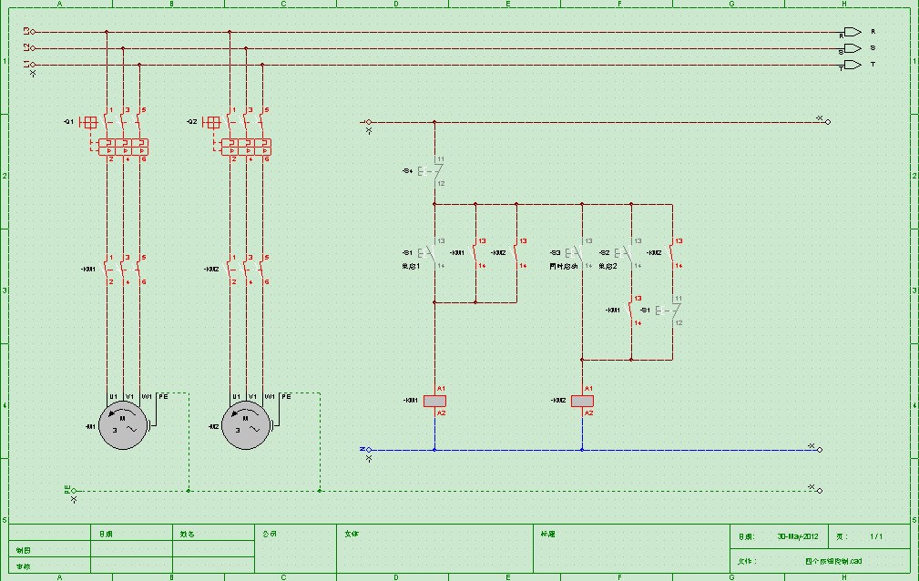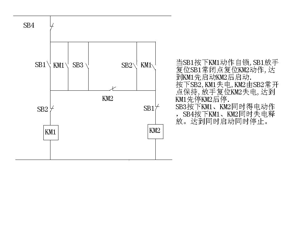 引用引用第72樓hds1990于2012-05-30 18:56發表的 :[attachment=85237]看看這個行不?我不是電工,業余畫畫。工作過程:1. 按下SB1,KM1啟動并自鎖,實現先啟動電機M1;然后可以按下SB4啟動KM2并自鎖,實現后啟動電機M2。按下SB2停止電機M1,實現先停止;再按下SB3停止電機M2,實現后停止。2. 單獨按下SB4,同時啟動KM1和KM2實現電機M1和電機M2同時啟動并自鎖,按下SB3同時停止電機M1和電機M2。3. 以上先后次序不能亂,即SB1-(電機M1先啟動)-SB4-(電機M2啟動)-SB2-(電機M1停止)-SB3(電機M2停止)。.......