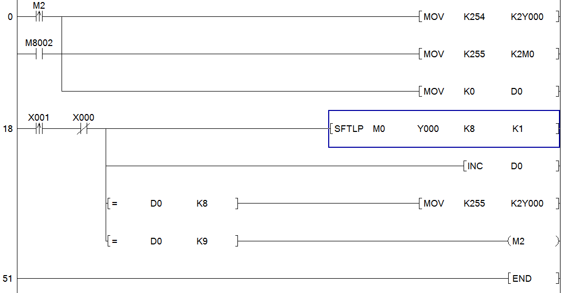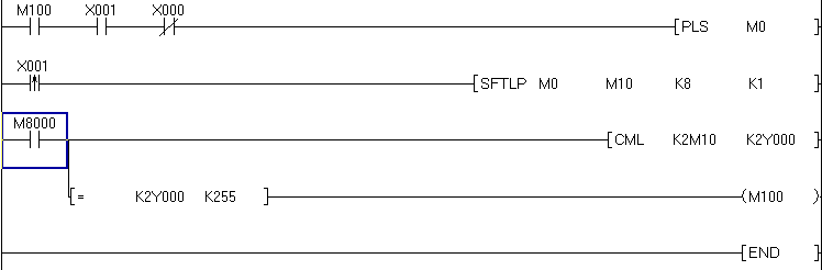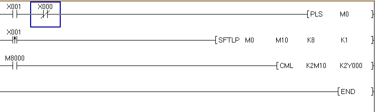 動作是這樣的:當測瓶光電測不到信號,Y0不動作,Y1-Y7是動作的,然后轉過一個工位(X1再次檢測到一個信號)后,Y0動作,Y1不動作,Y2-Y7是動作的,再轉過一個工位,Y0Y1動作,Y2不動作,Y3-Y7動作,以此類推直到Y7不動作,Y0-Y6動作,最后Y0-Y7全部動作