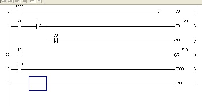 我為了學PLC前幾天去買了本郵電出版的《三菱FX/Q系列PLC自學手冊》,剛看了沒幾天居然發現有好幾個樣例圖是錯的。讓我死了不少腦細胞。比如下面說明CJ指令的程序,通電燈閃按下X0再按下X1常亮。在這里再請教一下師傅們在啟動了GX simulator仿真測試的時候修改了程序,要怎么才能繼續仿真。我每次都要退出再啟動才行。說明一下:圖中M1書中是M8000,忘了改回來。18后面有P0截圖時沒截到。