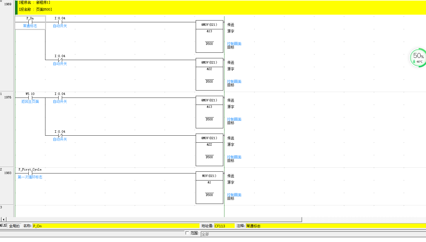 有一臺包裝機,PLC是歐姆龍的CP1L,觸摸屏是威綸通的TK6050ip,這個plc程序里可以通過賦值的方式來控制觸摸屏窗口自動跳轉到相應的界面,見附件截圖,I0.04是一個自動/手動的旋鈕開關,當它旋到自動模式時,I0.04得電導通,就給D500賦值成13,而觸摸屏的第13號窗口正好就是自動運行方式的窗口界面,我現在不明白的是這個程序中的D500是怎么樣跟觸摸屏的窗口序號進行關聯的呢,在程序中到處也找不到關于D500的定義,是要在觸摸屏的軟件中哪個地方進行設置嗎?請各位師傅指導我一下,謝謝了!